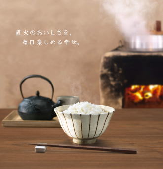 | かまどで炊いたごはんがおいしいのは、なぜでしょうか。 それは、釜の形や火加減だけではなく、直火の力で炊き 上げるから。 ガスの強火力で釜全体を一気に加熱。かまどと同じよう な伝熱形態で、お米一粒一粒に熱を行き渡らせて、炊き 上げます。 直火炊きならではの粘り、甘み、香りが際立ったごはん の本当のおいしさをぜひお楽しみください。 |