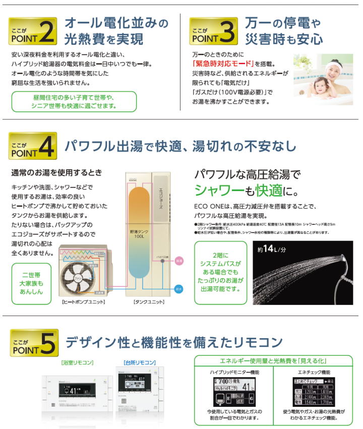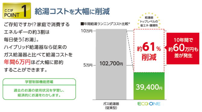 ハイブリッド給湯器「ECO ONE」は、電気とガスのイイトコドリしたハイブリッドな給湯暖房システムです。